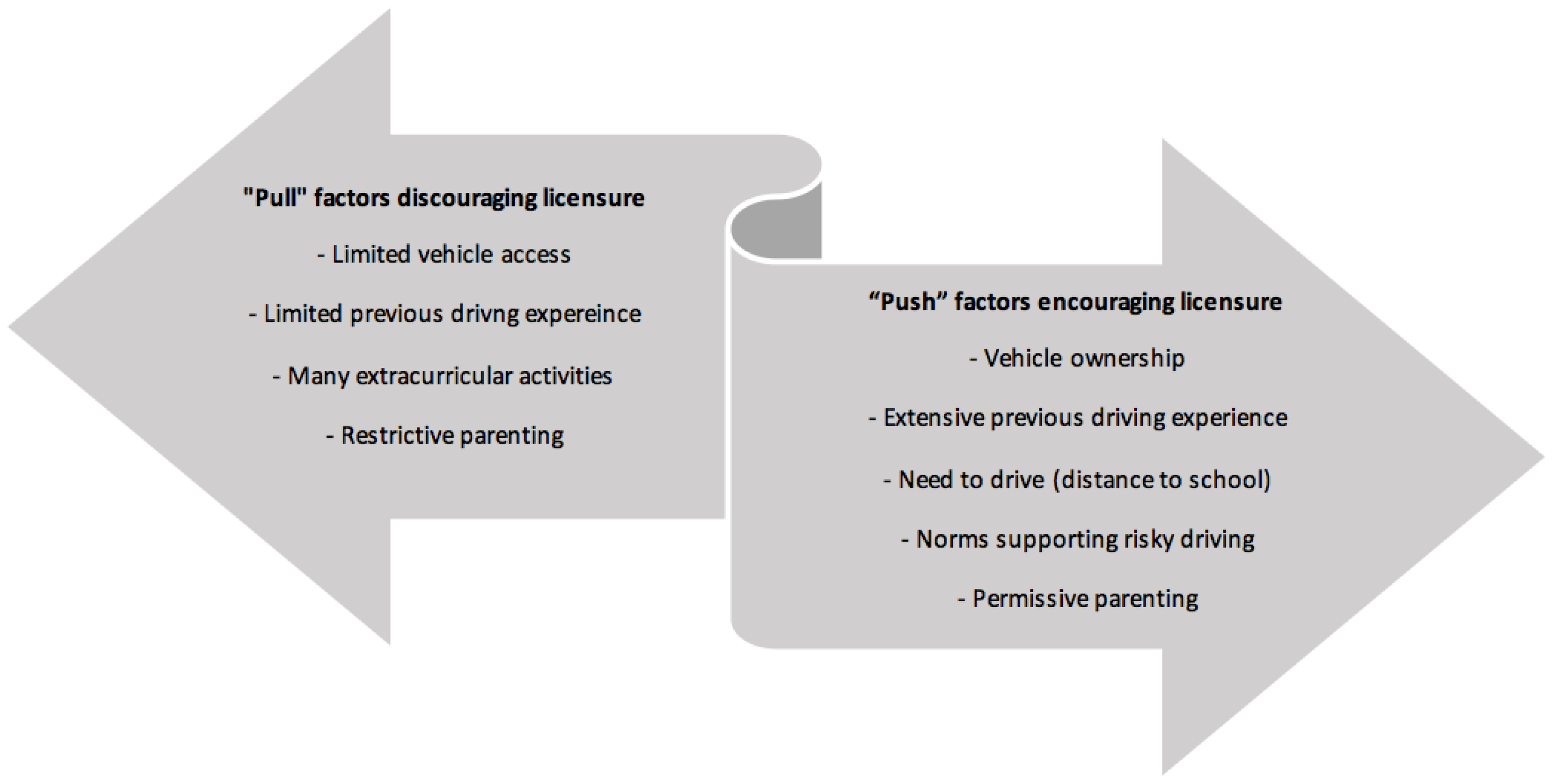 The purpose of this study was to examine the contribution of factors that push teens to advance quickly to independent licensure, or pull them back and result in a longer learner permit period. Two distinct findings emerged from the time-to-event analysis that tested these factors in relation to licensure timing. The first can be considered as teens’ motivation to drive (push), reflected in a younger age when obtaining a learner permit and extensive pre-permit driving experience. These may reflect an affinity towards cars and driving, or the presence of an enabling environment that facilitated early licensure and practice, to the extent some parents (and possibly others) allow early learner permits and (illegal) pre-learner driving. The second finding was parents’ knowledge of teens’ activities (pull); which can be considered as a proxy for a parents’ attentiveness to their teens’ lives. Teens who reported higher levels of their parents’ knowledge of their activities took longer to advance to independent driving.