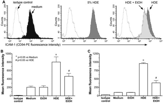 Alcohol pretreatment down regulates HDE-mediated ICAM-1 expression in human bronchial epithelial cells. BEAS-2B (B) and HBEC (C) were treated with control medium or 5% HDE ± 100 mM ethanol (EtOH) for 24 h and flow cytometry) analysis was performed. (A) Representative histogram showing significant rightward shift following HDE exposure (dark gray histogram), where open histograms represent isotype control antibody. Panel on far right depicts HDE treatment compared to EtOH + HDE treatment. Bar graphs depict means with standard error bars from N = 6 (B) and N = 3 (C) independent experiments. * p < 0.05 vs. control medium, # p < 0.05 vs. HDE.