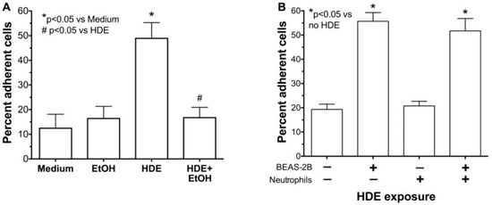 Alcohol inhibits HDE-induced peripheral blood neutrophil adhesion to epithelial cells. (A) BEAS-2B cells were pretreated with 100 mM ethanol (EtOH) prior to exposure to 5% HDE or control medium for 24 h. Neutrophils were then allowed to adhere to stimulated BEAS-2B for 30 min. HDE causes a significant increase in neutrophil adhesion compared to medium alone. Pretreatment with EtOH causes a significant decrease in HDE induced adhesion; (B) Neutrophils were treated directly with 5% HDE and then incubated with BEAS-2B. Treatment of neutrophils with HDE does not stimulate adhesion to untreated BEAS-2B. Bar graphs represent means with standard error bars of 4 independent experiments, * p < 0.05 vs. control medium, # p < 0.05 vs. HDE.