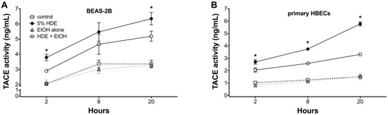 Alcohol pre-treatment inhibits HDE-induced TACE activity in BEAS-2B and primary human bronchial epithelial cells. Lysates from BEAS-2B (panel A) primary human bronchial epithelial cells (HBECs; panel B) pretreated with or without 100 mM ethanol for 1 h before exposure to 5% HDE or control medium for an additional 2, 8, or 20 h were assayed for TACE activity. HDE stimulated TACE from 2 to 20 h, but alcohol pretreatment blunted HDE-induced TACE activity at all time points. Data shown represent the means (±SEM) of 3 separate experiments (* p < 0.05 vs. HDE + EtOH).