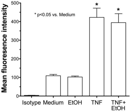 Alcohol does not directly affect TNFα-induced ICAM-1 expression. BEAS-2B were treated with either TNFα (0.1 ng/mL) or TNFα incubated with 100 mM ethanol for 1 h before epithelial cell treatment. FACS for ICAM-1 revealed a significant increase in ICAM-1 expression even when cells were treated with TNFα + ethanol. Bar graphs represent the mean with standard error bars of 3 separate experiments (* p < 0.05 vs. control medium).