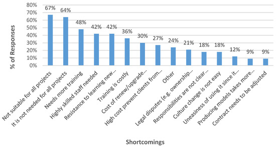 It is assumed that all technology solutions come with shortcomings, and BIM is one of these solutions. The shortcomings might arise from the use of the technology itself, the conditions of the work environment in which the technology is used, or other factors. Different drawbacks of using BIM should be considered from the engineer’s perspective. The most cited shortcomings are its lack of suitability for all projects and an absence of a need for BIM on all projects. Linking this result with the high cost of owning and operating the technology [