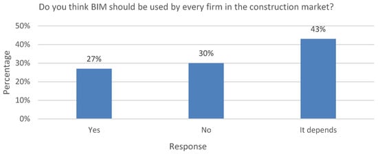 In this study, the researchers intended to explore the issue of using BIM in firms from a field management engineer’s perspective. This procedure is intended to gauge how much the respondents consider the feasibility of implementing BIM when making decisions about BIM use. The majority of respondents (43%) believe that the decision related to feasibility depends on different factors. More than half of the 43% majority indicated that project size is the primary factor in deciding whether to use BIM or not. Other respondents considered the cost of using BIM as an important factor. Eleven of the respondents (30%) were against the idea of using BIM for all projects in all firms. This response is realistic when considering the previous reasoning about those respondents who worked on specific projects that have not used BIM. The last group is composed of those respondents who feel that all firms should use BIM. This response is not justified, in the authors’ opinion, as it does not consider the feasibility of using the technology. However, the respondents might answer in this way if they have a specific measure in mind, such as considering only large and complex projects. This result requires additional investigation to gain a clearer and comprehensive understanding of the responses.