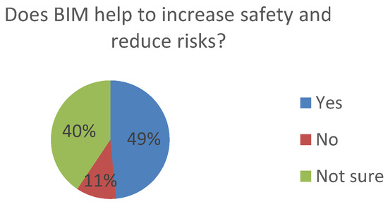 To ensure that the respondents were consistent with their answers, the questionnaire included a direct question regarding personnel construction safety and whether safety performance improves, as a result of reducing risk, when BIM is used. Forty-nine percent of the respondents believe safety improves when using BIM and 40% were unsure of its impact, as shown in