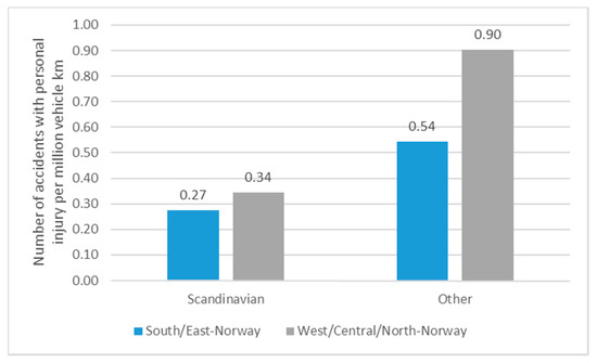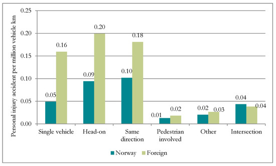 Our estimates of personal injury accident risk must be interpreted with some caution, because of the following uncertainties and challenges: (1) There are a total of 363 HGVs with unknown nationality in accidents in the period 2007–2012. As noted, these are added to the Norwegian HGVs involved in accidents in the calculations of accident risk; (2) There are relatively few foreign vehicles (11%) involved in accidents; (3) The nationality of vehicles and drivers may be different; (4) The risk of accidents involving personal injury and material damage may be different; (5) The risk of serious accidents is influenced by where you drive—i.e., roads and road environment. Foreign HGVs are primarily involved in long-haul (international) transport on roads with higher standards, and we may underestimate their accident risk; (6) Different types of HGVs have different accident risks [32]. and (7) The risk of triggering traffic accidents may be different to the risk of being involved in a traffic accident.