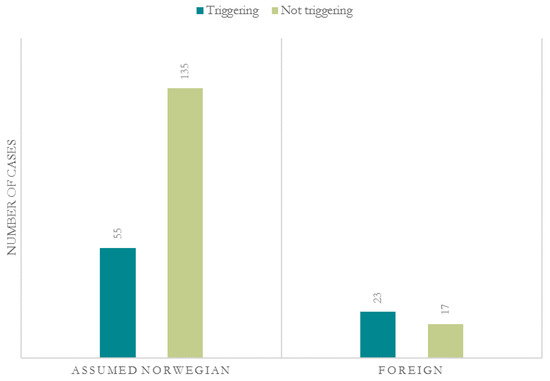 Less than a third (29%) of the Norwegian professional drivers (55 of 190) drove “triggering” vehicles but more than half (58%) of the foreign drivers (23 of 40) did so. The proportion of triggering drivers was similar in the group of professional drivers driving a foreign registered vehicle and in the group of professional drivers driving a Norwegian registered vehicle. Of the 40 foreign professional drivers, 35 drove HGVs, while 5 drove buses. In comparison, 23 of the assumed Norwegian drivers drove buses. Thus, buses represent about 12% in both groups.