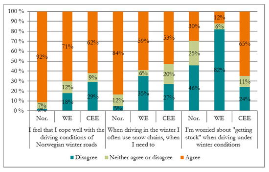 In the qualitative interviews with stakeholders, interviewees underlined that Norwegian road conditions place strong demands on (foreign) drivers’ competence, especially in the parts of Norway with relatively poor road quality—e.g., in northern parts of Norway. When referring to interviewees in the text, we always refer to the qualitative interviews with the sector experts (cf. Section 3.4), and not interviews with drivers. Interviewees stated that driving safely is strongly dependent on driver experience, which allows them to judge situations correctly, evaluate risks and adapt their speed to conditions. Because of their experience, the Norwegian drivers are able to recognize dangerous situations and judge risks correctly. For the foreign drivers, on the other hand, the Norwegian roads may come as a surprise, interviewees suggested. Driving in hilly terrain requires a lot of driver competence and experience, for instance related to using motor brakes and adaptation of speed. Being foreign to the Norwegian road conditions, with varying standards and sometimes poor roads, is a disadvantage in itself, because you do not know what to expect, or how to adapt to the conditions. Interviewees and reference group members especially underlined differences between Norwegian and foreign HGV drivers’ experience and competence with driving on winter roads, a topic that we discuss below.