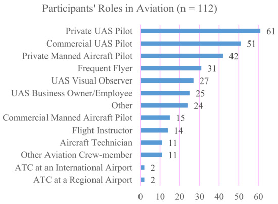 Phase 2: Bar graph depicting participants’ reported roles in aviation; the total number of included participants is 112. The label ‘frequent flyer’ applies to pilots or passengers and the acronym ‘ATC’ stands for air traffic controller. Categories were not mutually exclusive.