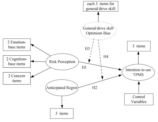 The concept of optimism bias is that people perceive their likelihood of experiencing negative events to be less when compared with an average individual or a group which is similar to them [82]. This concept has been obtained for a wide variety of health risks [83]. In a study of AIDS-related risks, Van der Pligt et al. [84] found that for groups aware of their relative risk status, high-risk groups gave higher ratings of their own risk than low-risk groups, and all groups showed an optimism bias and thought their risks were lower than those of an average person of their age and gender. Harre et al. [85] found that a higher perception of driving skill was associated with a lower perception of accident risk. Harre and Sibley [86] noted that a number of studies have found that drivers tend to consider themselves superior to their peers in areas such as driving skill, reflexes, judgment, and safety. Optimism bias can lead to overconfidence [27], and lead drivers who believe that they are safer than the average driver tend to think injury prevention campaigns do not apply to them [87]. Martha and Delhomme [88] pointed out that most of the participants expressed comparative optimism regarding speeding-ticket risk and speeding-induced crash risks. Consequently, we suggest that people who tend to consider themselves superior to others in driving skills, reflexes, judgment, and safety will have a lower degree of risk perception, which will in turn affect their intention to use TPMS. Thus, we hypothesize that: