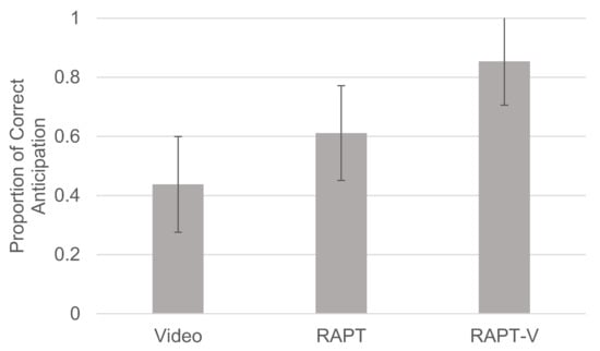 Mean proportion of correct anticipation performance across the training conditions (Video, RAPT and RAPT-V conditions). Error bars represent between-participant 95% confidence intervals.