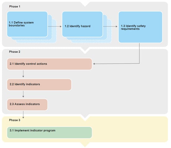 The next step of the framework is to identify the hazards to be mitigated with the safety indicator program. The definition of a hazard in STPA is “a system state or set of conditions that, together with a particular set of worst-case environmental conditions, will lead to an accident (loss event)” []. A feasible approach may be to define a main systemic accident that is to be avoided and then list the hazards that contribute to the accident. The schematic representation of the system from Step 1.1 may be used to identify where in the control structure the hazards will occur.