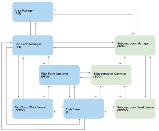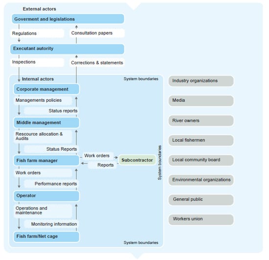 The system boundaries can be drawn around the fish farm organization and the subcontractor. The legislators and their executant authorities are also important parts of the sociotechnical system, together with the fish farming companies. They provide the regulations that the fish farmers have to follow and they perform inspections to ensure conformity. Examples of safety relevant regulations can be found in Holmen, Utne []. Nevertheless, the focus should be on the fish farm organization and the components of the system to be analyzed should be within the organization’s reach to alter. Stakeholder that could influence aspects of the operations of fish farms are noted, such as the local community authorities, the local wild fish river owners, the media, the public, and environmental organizations. These should be kept track of as they potentially may influence parts of the fish farm operations. For example, the large concern with prevention of fish escape may shift the focus of the human operator away from his or her personal safety. Environmental organizations have performed stunts on fish farms, for example, using underwater cameras to monitor environmental impact under the fish farms, which could disturb normal operations due to, e.g., trespassing.