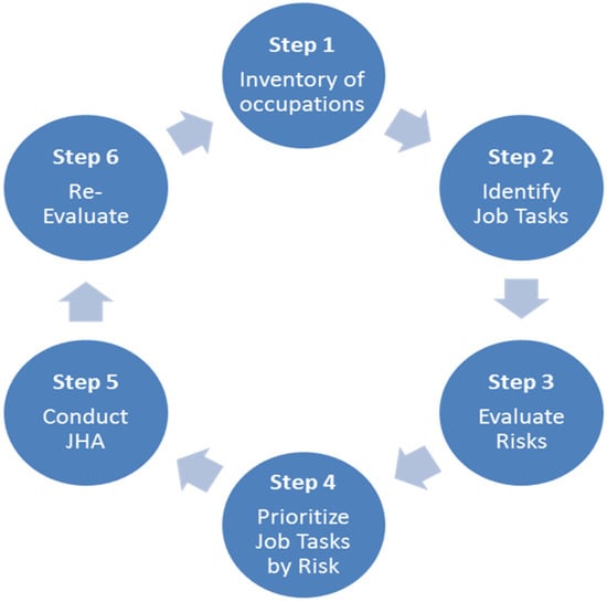 Job Safety Analyses (JSAs), also referred to as job hazard analyses (JHAs) and job hazard breakdowns, are performed in order to integrate, into the daily work life of employees, proper health and safety principles and practices [,]. This is focused directly on the work completed by personnel in the workplace, as well as, the overall facility. At each step of a particular operation, the goal is to identify potential hazards and to recommend the safest way to do the job [].