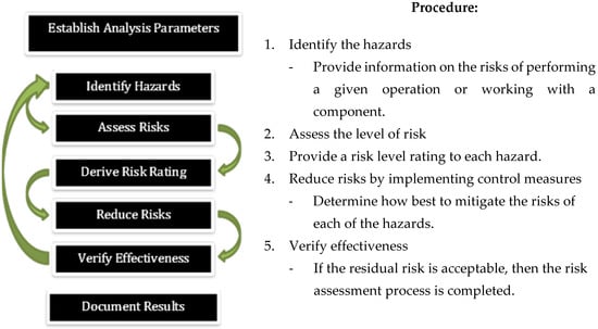 In order to establish proper safety protocols for given operations, the associated hazards need to be determined []. Defining all possible hazards though can be quite difficult to complete, especially if systems are unfamiliar to personnel. This process involves performing research and literature reviews to better understand the hazards associated with each component and operation. The process of performing Hazard Analysis and Risk Assessment is as follows (detailed in Figure 5) []: