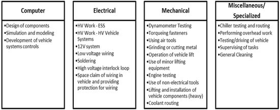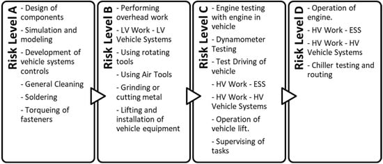 Safety is an integral part of every job and should be the focus when completing work. Providing personnel with the proper training on equipment and operations reduces the chances of a hazard occurring []. With the team, there are many operations that need to be completed on the vehicle in order to ensure that the goals of the overall project are accomplished. Also, as we can be considered a “small business,” there are only so many resources that the team can draw upon to complete these assessments. Thus, tasks need to be effectively analyzed from the first point of contact.