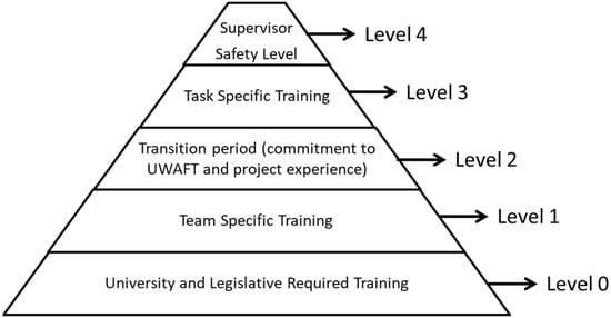 Gamification refers to the process of applying game playing elements to other areas of activity []. UWAFT can apply these principles into the development of an effective safety training program, which uses a level based system. By attaining certain requirements members can move up through the levels to gain the ability to work on more advanced systems. For instance, as a hypothetical example to move from Level 2 to Level 3, a certain number of hours at that level need to be accrued to show that the student gains experience at performing “Level 2” work before he or she can receive training on the next level. This is to ensure experience, on use of a variety of tools and systems, has been obtained by students before beginning Level 3 activities.