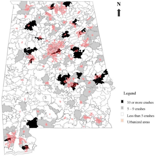 Previous research has established relationships among increased propensity of fatal crashes, low population densities, and socioeconomic deprivation [,,,,,,,,,,,,]. More pointedly, a longitudinal study concluded that young drivers that are associated with lower socioeconomic opportunity (particularly educational) were more likely to be involved in serious crashes, especially single-vehicle crashes []. Such conditions are certainly representative across many rural areas throughout Alabama and elsewhere. For example, a suite of nine spatial econometric models of relationships among socioeconomic factors and DUI crashes in Alabama all indicated that educational attainment and income levels for an individual postal code significantly contributed to lower rates of DUI crashes among the residents from that postal code. Further, seven of the nine models also indicated that DUI crash rates among residents of a given postal code were lower among more urbanized areas, as measured by the percentage of rental households in each postal code []. The relationships were further supported by Geographic Weighted Poisson Regression analysis of socioeconomic factors affecting DUI crashes in Alabama []. Some of the postal codes in Figure 3 indicating higher instances of fatal crashes among younger drivers overlap or are in the vicinity of urbanized areas. Material deprivation (i.e., socioeconomic opportunity) is often as or more associated with risky driving behaviors among youths in urban and suburban locations as well [].