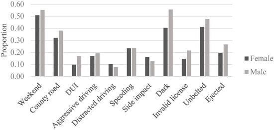 In Figure 1, the postal codes that are colored black indicate that ten or more drivers from that postal code caused a close-to-home crash over the study period. Postal codes colored grey indicate that 5–9 drivers caused close-to-home crashes, and white postal codes indicate that less than five caused close-to-home crashes. Finally, the areas marked in red hatching show the boundaries of the urbanized areas as designated by the U.S. Census Bureau []. Figure 2 provides a comparison of the risky driving behaviors among male and female young drivers.