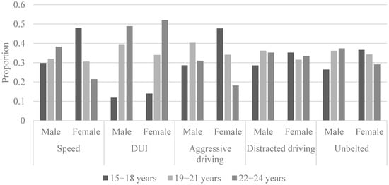 Figure 2 shows that, while more fatal crashes are caused by young male drivers than young female drivers (Table 1), the proportions of total fatal crashes due to speeding and aggressive driving are similar for male and female drivers. Figure 3 shows a further breakdown of the gendered driving behaviors by subgroups of younger drivers.