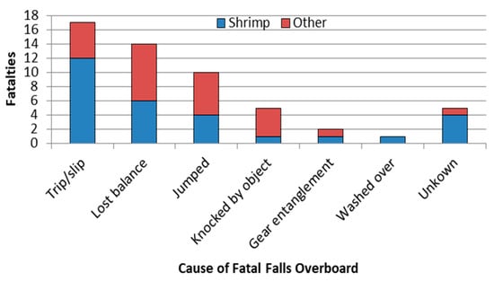 Based on USCG data, Day et al. identified 31 fatal injuries in New Jersey for the period 2001–2007 on commercial fishing vessels, 16% of which were FOBs. Other causes included crushed between objects (39%), non-contact injuries (32%), asphyxiation (13%), diving (10%) and exposure (10%) []. Case et al. investigated 28 fatalities based on USCG data in a study of fatal and non-fatal injuries among Dungeness crab fishers in California, Oregon, and Washington, 20 of whom lacked time to don survival equipment, and eight recovered bodies lacked PFDs []. Both of these studies used USCG data, which can as a method inform GoM research.