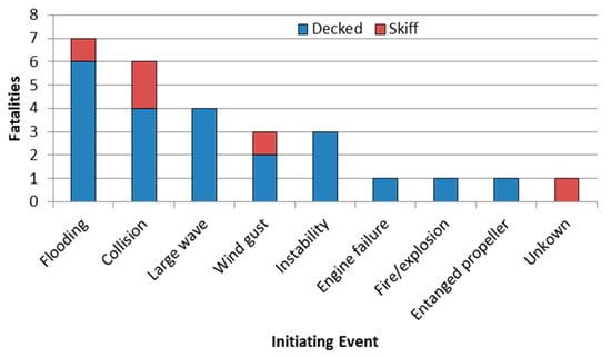 The 2010 study also determined the highest cause of FOB was “trips and slips” on the deck followed by “lost balance,” as shown in Figure 1. It also found that the two leading causes of vessel disaster in the GoM were flooding and collision, as shown in Figure 2 [].