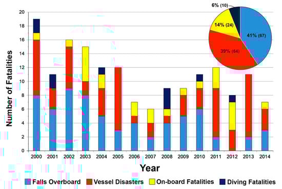 Number of commercial fishing fatalities in the Gulf of Mexico for 2000–2014 (n = 165). Inset chart shows principal cause of death as a percentage of fatalities. Sources: Lincoln and Lucas 2010 [] and Syron et al. 2017 [].