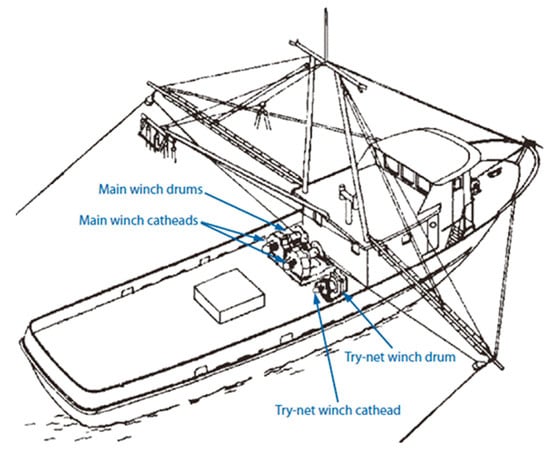 Main and try-net winches shown on a drawing of a double rig shrimp trawling vessel, Courtesy NIOSH [].