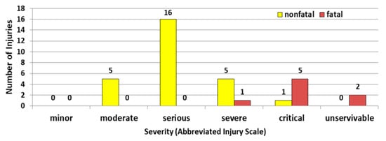While fatalities are threshold events for many investigations, less attention had been given to non-fatal injuries. However, the USCG classifies injuries by severity based on the Abbreviated Injury Scale (AIS). This scale covers a range of injuries as follows: 1 (minor), 2 (moderate), 3 (serious), 4 (severe), 5 (critical) and 6 (maximal, untreatable), based on the risk of death []. Some researchers in the United States used USCG AIS classifications in studies of fisher non-fatal injuries. Below, we review two studies in the GoM followed by 13 other studies of non-fatal injuries outside of the GoM.