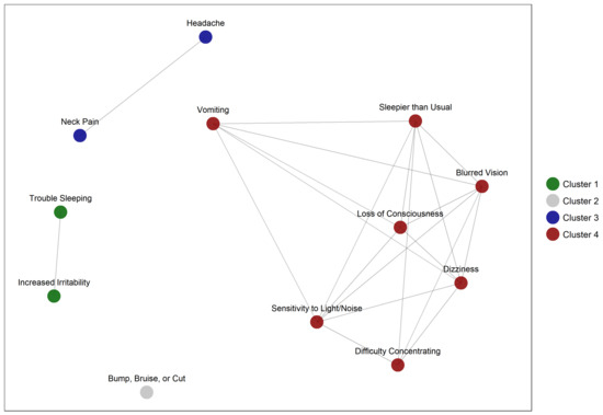 Figure 2. Clusters derived from community detection analysis. The clusters with each symptom’s mean intention score were: Cluster 1: Increased Irritability/More Emotional (2.6), Trouble Falling or Staying Asleep (2.9); Cluster 2: Bruise-Bump-Cut (2.9); Cluster 3: Headache (2.9), Neck Pain (3.1); Cluster 4: Difficulty Concentrating (3.4), Feeling Sleepier (3.4), Vomiting (3.5), Sensitivity to Light/Noise (3.6), Feeling Dizzy (3.6), Blurred Vision (3.8), Loss of Consciousness (4.0).