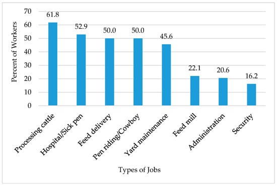 The findings showed that the majority of participants processed cattle, worked the hospital pen, delivered feed, or rode pens. Based on data provided from the AgriServices Agency (a provider of insurance to agricultural operations), these jobs (e.g., cowboys, pen riders, and truck drivers) had a higher number of injuries than other feedyard jobs [25]. Previous research has demonstrated that immigrant workers may be concentrated in riskier types of jobs where there is a higher potential for injury or illness [26,27]. In fact, across industries, about one-fifth of all occupational fatalities in the United States occurred to foreign-born workers [4].