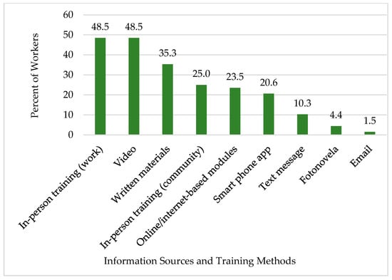 Nearly 90% of workers were interested in receiving more information about health and safety issues related to their job. A majority of participants (83.6%) preferred to receive information in Spanish. Workers preferred information to be provided through in-person training at the job site, videos (particularly those accessible through media sources such as YouTube), and written materials (Figure 2). There were significant differences in worker preferences for receiving information based on English proficiency and level of education. English proficient workers were more likely to prefer receiving information online than non-English proficient workers, χ2 (1, N = 68) = 5.22, p = .02. Workers who had completed a high school education or higher were more likely to prefer receiving information online than those with less formal education, χ2 (1, N = 68) = 8.34, p = .02.