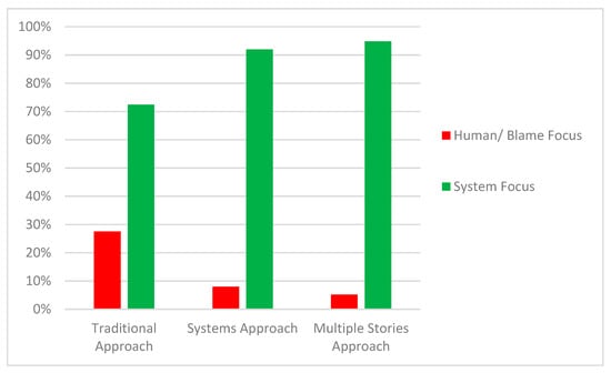 Overall, participants were more likely to propose system-focussed corrective actions (255 actions, 86.44%) than human error-focussed (40 actions, 13.56%). However, the actions participants proposed to manage the issues which led to the accident varied greatly depending on the style of the report, the framing of the story and the language used to describe the event. Participants provided with the traditional approach report were more likely to suggest actions with a human error/blame-focus (27 actions, 27.55%) than those provided with the systems approach report (8 actions, 8%) or the multiple stories approach (5 actions, 5.15%) reports, χ2 = 25.39, p < 0.001, see Figure 1.