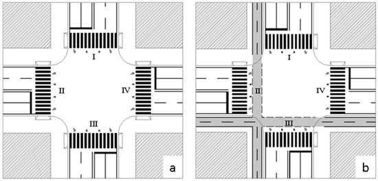 Two geometrical layouts of a four-arm urban intersection have been considered—their configurations are with (Figure 1b) and without (Figure 1a) the bicycle lane or path.