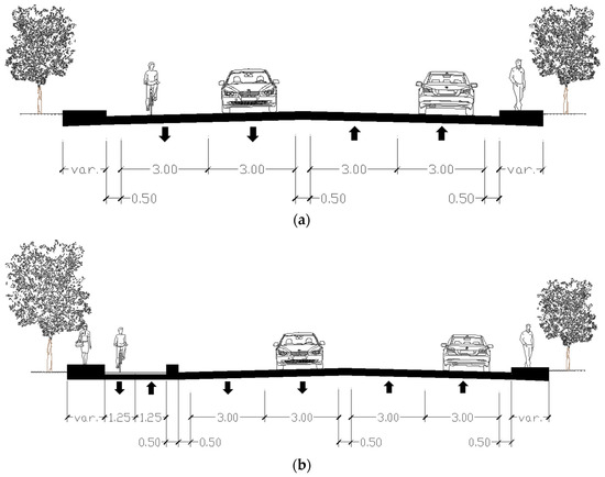 For both cross sections, vehicle lanes are 3.0 m wide, shoulders are 0.5 m wide, and medians are 0.5 m wide; cyclists run on the carriageway (Figure 1a) or on the bike path, composed of bike lanes. Each bike lane is 1.25 m wide (Figure 1b).