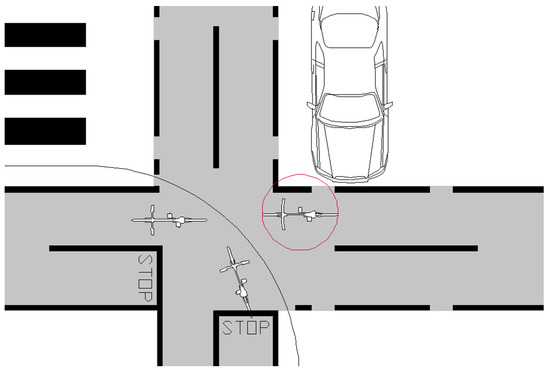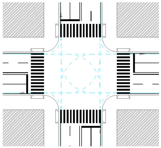 - Scheme 1 (S1) is a symmetrical four-arm intersection without a bike path. The cyclists use the carriageway to cross the intersection (Figure 5a);