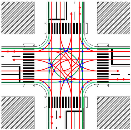 In Figure 4, the bikes’ trajectories are blue, the vehicles’ trajectories are green. According to the Transportation Research Board Access Management Manual [40], traffic conflict points occur where vehicle paths cross, merge or weave, and the drivers take evasive actions to avoid collision. In this research, all possible conflict points between the motorized vehicles and bicycles, have been considered—bicycle-to-bicycle conflicts were not considered because their frequency is low in Italy [41]. In Figure 4, the detected conflict points at a four-lane four-arm intersection are red—there were 56.