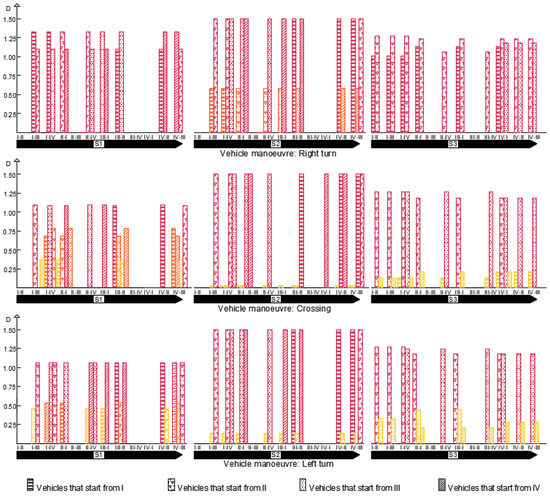 The analysis of CP, per allowed maneuver of a vehicle, provided the results in Figure 7. Each bar graph represents the damage level D, calculated for each detected CP, when vehicles turn right, cross, or turn left, and bikes move between the specified arms. The bar’s colors are compliant with those in Table 1. Therefore, the top-left bar graph represents the damage level for bike paths conflicting with vehicles turning right, at intersection S1. In contrast to the data listed in Table 3, Figure 7 represents the D values of all functional CPs, which can possibly coincide. In Table 3, coincident CPs have not been considered; Figure 7 represents the opposite of this scenario.