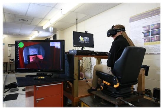 The equipment used in this study included the Oculus Rift DK2 headset, a joystick for operation of the LHD within the simulator, and the Situational Awareness Mining Simulator (SAMS), created at Laurentian University through the Centre for Research in Occupational Safety and Health. Ethical approval for the study was granted by the Research Ethics Board for the university (Case 2015-11-10). Based on previous work, a power calculation was performed based on the reported differences in collisions between the practice trial and the average of the session trials to determine that the optimal sample size was n = 15 in a repeated design [9]. This closely matched the sample size required (n = 13) for an independent design using the number of pedestrian collisions from Kass et al. [10]. The intent was to collect at least 20 participants, and we were successful in recruiting 22 participants. However, only 18 of the participants completed the study in its entirety, with usable data for analysis. There were 13 females and 5 males tested with ages ranging from 18 to 27 years, and the average age was 21.0 (SD = 2.52). Participants were randomly assigned to one of two groups, tutorial or no tutorial. The tutorial was a five-minute session in a separate virtual reality (VR) space that provided an overview of the LHD machine, how the controls worked, and how to navigate in VR. All participants then completed five sessions lasting five minutes each in the simulator (Figure 1).