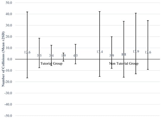 The lack of significance for the collision variable was largely due to the large variability in response demonstrated in Figure 3. A standard deviation error bar graph was created to demonstrate the high levels of variance in total number of collisions across each session, as a function of tutorial vs. non-tutorial groups (Figure 3). Descriptively, the variance in the non-tutorial group appears to be greater across the five sessions whereas the variance in the tutorial group appears to be decreasing across time.
