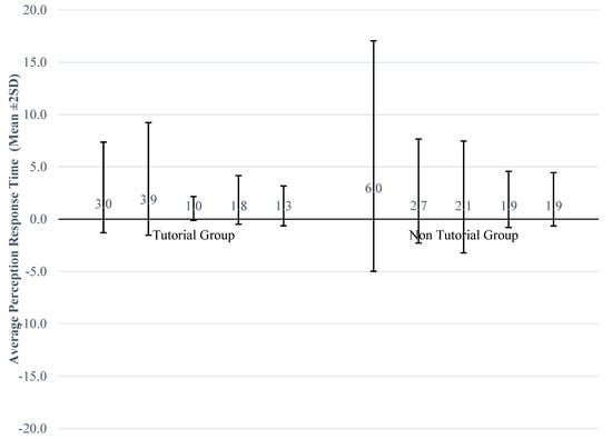 Standard deviation error bar of perception response time from each session vs. tutorial and non-tutorial groups.