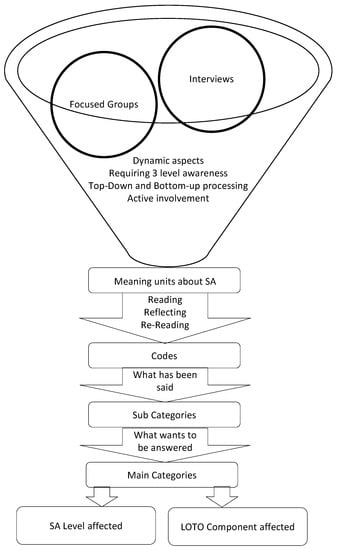 We closely examined the qualitative data obtained from interviews and the focus group discussion to segregate what was relevant to the research objectives. Then, we delineated the meaning units related to the research objectives. One major challenge was to filter the meaning units referring to SA. The three-level SA model is conceptually similar to human information processing models [16,37,38]. We had to avoid creating a traditional information processing model [39], whilst carefully selecting the meaning units reflecting specific characteristics of SA. Criteria used for selection were dynamic aspects of the situation (not static information), situations requiring the knowledge of three levels of SA [14], situations requiring both top–down and bottom–up information processing (not merely linear information processing) [40], and the active (not passive) nature of the person who is seeking information [17]. Then, the units were condensed to shorter versions by determining the underlying meanings.