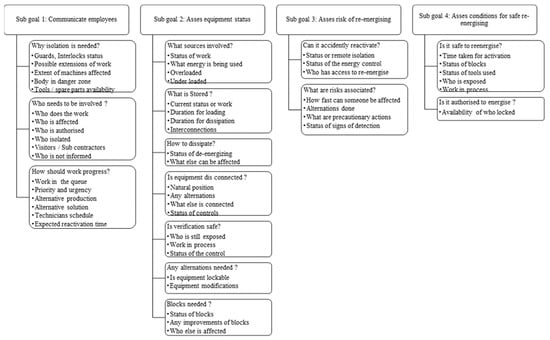 Following the general steps of GDTA, we identified users’ major goals, sub goals, decision-making requirements for the sub goals, and SA information requirements. The major goals of both maintenance technicians and operators during a maintenance scenario are twofold: accomplishing the task correctly (maintenance/production) on time and ensuring the safety of the equipment, themselves, and affected employees. Our focus was on the SA requirements of LOTO, specifically, its major purpose of helping workers comprehend the environment and foresee risks to avoid accidents. Therefore, we excluded drilling down to the subcategories of the tasks under accomplishing the maintenance/production task; we continued analysis for the safety component only. In order to ensure employee and equipment safety, we identified four sub goals: communicating with other employees, assessing equipment status, assessing the risk of reactivation, and assessing the conditions for reactivation. Then, we determined the decision-making requirements for each of the sub goals. Finally, we identified the data required (Level 1 SA), the higher-level information on the significance of the data (Level 2 SA), and the projection of future events (Level 3 SA) for each of those sub goals (see Figure 3).
