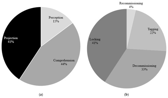 The subcategories (presented in Figure 4) are data-driven, but major categories are concept-driven. Therefore, the outcome of the meaning units for our two major categories served our second objective. The first part of the second objective refers to classifications for the SA levels affected. Meaning units (N = 27) were categorized under perception (n = 4, 15%), comprehension (n = 12, 44%), and projection (n = 11, 41%) (see Figure 5a). Overall, comprehension and projection appear to be highly affected, but the perception of information is not. This finding is different in other domains; in a study of aviation, for example, 76% of the pilot errors were traced to problems in perception, and 20% were associated with comprehension [14]. However, it should be noted that the aviation study used retrospective analysis; we present how users perceive the LOTO ability to support SA. Despite the difficulties, users might be able to comprehend the situation and project future events by exerting more cognitive effort. This may not be the result in a retrospective analysis.