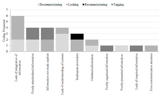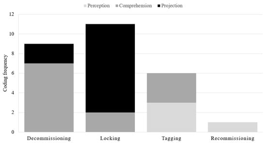 The distribution of coding frequencies for different LOTO components with respective levels of SA affected gives insight into the completeness of the state of the employees’ knowledge [14] at each LOTO stage. Although there were no perceptual challenges at the decommissioning stage, comprehension of that information seemed to be challenging. In contrast, what was challenged most at the locking stage was the projection of future status. Tagging was equally problematic for perception and comprehension. Finally, recommissioning was the least challenged component; here, only perception seemed to be challenging. In general, perceptual challenges were the least often found in this study. They became more prominent at later stages: tagging and recommissioning.