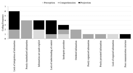 In summary, regardless of the main category, lack of integration of information (n = 6) has the highest coding frequency of the subcategories. This is followed by poorly standardized information (n = 4), information not being made explicit (n = 4), and a lack of understanding surrounding the context (n = 4) (see Figure 4).