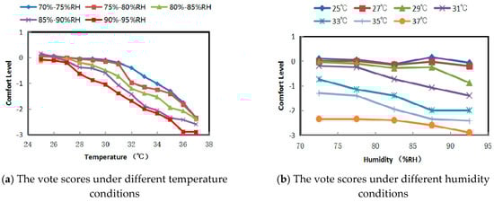 As Figure 5a shows, when the temperature inside the chamber was below 27 °C, the curves for human comfort at different temperatures tended to be consistent, which indicated that the humidity inside the chamber had little effect on human thermal comfort. When the temperature was higher than 27 °C, the comfort tended to be reduced with the increase in temperature and the curves for different humidity levels started to diverge. It appears the influence of humidity on comfort increases gradually at this temperature point. Combined with the results shown in Figure 5b, it becomes apparent that the comfort level slightly oscillates in a range of ±0.1 and was hovering around zero points when the temperature was below 27 °C, which indicates that the changes in humidity has little effect on comfort level at low temperatures. When the temperature is between 28–31 °C and the humidity is higher than 75%, the comfort level decreases rapidly with the increase in humidity and the comfort level changes from slightly hot to sweltering. The comfort value decreases by approximately 0.5 per 10% increment of the humidity. The results show that, in this temperature range, the changes in humidity have little effect on comfort when the humidity is in a range that is not very high (below 75%) and would result in a sharp drop in comfort when the humidity is at a higher range (above 75%). When the temperature is higher than 31 °C, the comfort level decreases rapidly with the increase in humidity. On average, the comfort level decreases by approximately 0.7 per 10% increment of the humidity. When the temperature reaches 37 °C, the normal temperature of the human body, the subjects reach the limit of the temperature range the human body could withstand. In this case, the limit on the temperature value depends entirely on personal physical condition, regional climate or other factors. The comfort level is in the unbearable range (−3), no matter how the humidity changes. It can be concluded that changes in humidity have a significant effect on thermal comfort at a high temperature range (31~37 °C).
