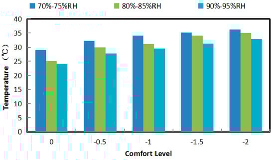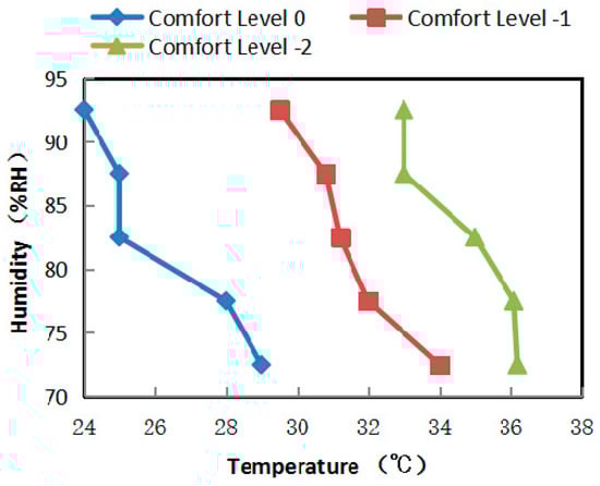 As shown in Figure 7, when the comfort level is 0, the temperature decreases by approximately 1–3 °C per 10% increment of the humidity; when the comfort level is −1, temperature decreases by approximately 1.5~2.5 °C per 10% increment of the humidity; and when the comfort level is −2, temperature decreases by approximately 1.5~2.5 °C per 10% increment of the humidity. This outcome occurs because, in this case, the sense of comfort is most sensitive when the comfort level is 0, and the changes in humidity are the largest compared to the extent of change for temperature. According to the statistics, if the temperature is higher than 25 °C and the humidity is higher than 70% RH, the temperature decreases by approximately 2 °C per 10% increment of the RH when human comfort is constant.
