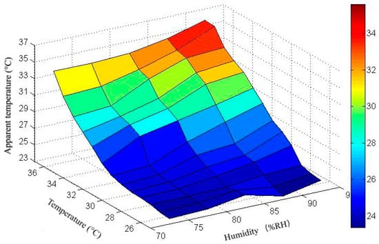 Under different circumstances, the classification standards of comfort are also different. Previous studies have shown that some humans have no intuitional feeling of comfort [,,]. In this paper, the comfort levels 0, −1, −2, and −3 are matched with 26 °C, 30 °C, 34 °C, and 38 °C, which are true human thermal responses to the environmental temperature. Through processing of the previous data, a curve of the human apparent temperature and the temperature and humidity inside the chamber is obtained (Figure 8). Furthermore, through linear regression analysis of the data, a functional relationship between human apparent temperature and the environmental temperature and humidity can be described as Formula (1).