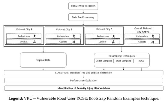 This section describes the techniques used for data resampling, followed by a short description of the classifier methods: decision tree and logistic regression. The classifiers will be applied to identify the variables which are statistically significant in predicting the injury severity of a VRU involved in a crash. Lastly, data characteristics and pre-processing as well as case studies are described. The conceptual framework designed for this study is presented in Figure 1. This process was applied for each city individually and a global dataset including all crash and injury information.