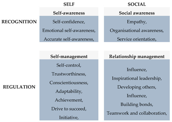 A more recent model of emotional intelligence is the Goleman 2012 model [38]. It comprises 4 principal domains and 19 confidences. The four domains include self-awareness, social awareness, self-management and relationship management. Figure 2 shows the four broad domains of emotional intelligence as developed by Goleman [38]. The 19 confidences included in the 4 broad domains are also shown.